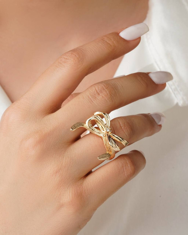 انگشتر پاپیون که با طراحی خاص و الهامگرفته از فرم پاپیون دیده میشود جلوهای ظریف و در عین حال چشمگیر به دست بخشیده است. خطوط منحنی و بافتدار در ساخت این مدل، حس لطافت و حرکت را القا میکند و جزئیات دقیق آن نشاندهنده ظرافت در طراحی و اجراست.